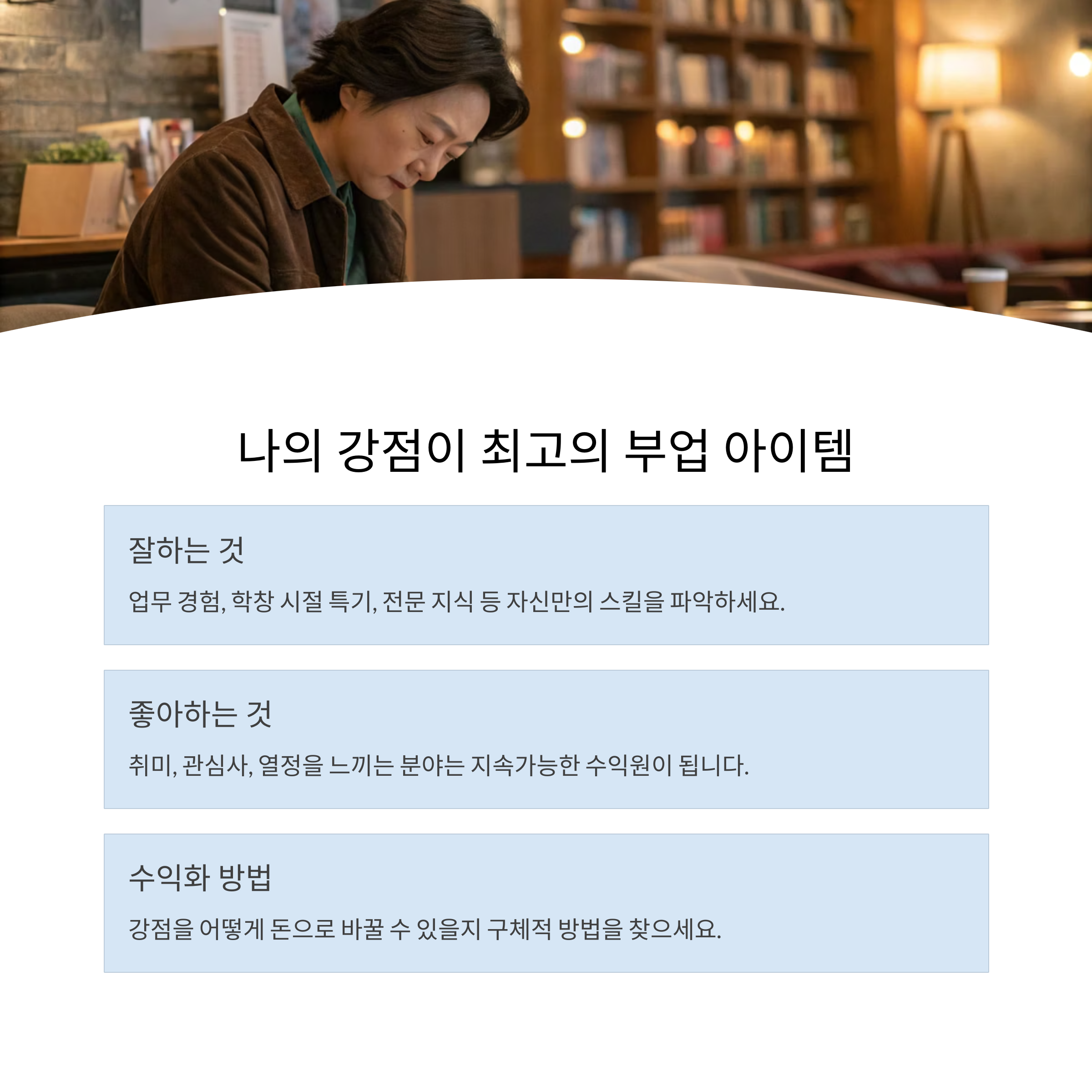 | 경제적 안정과 미래 대비 | 강점 분석과 시간 관리 | 초기 투자 최소화 |