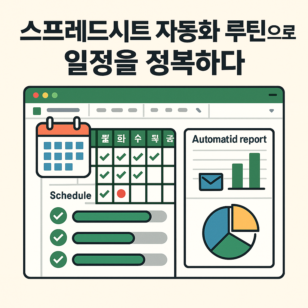 할 일은 많고, 시간은 부족하신가요? 반복적인 일정 관리, 진행 상황 정리, 보고서 작성까지… 이 모든 걸 한 번에 자동화하는 루틴이 있다면 어떨까요? 이번 글에서는 구글 스프레드시트를 활용해 일정 관리부터 보고서까지 연결된 자동화 루틴을 구성하는 방법을 소개합니다.