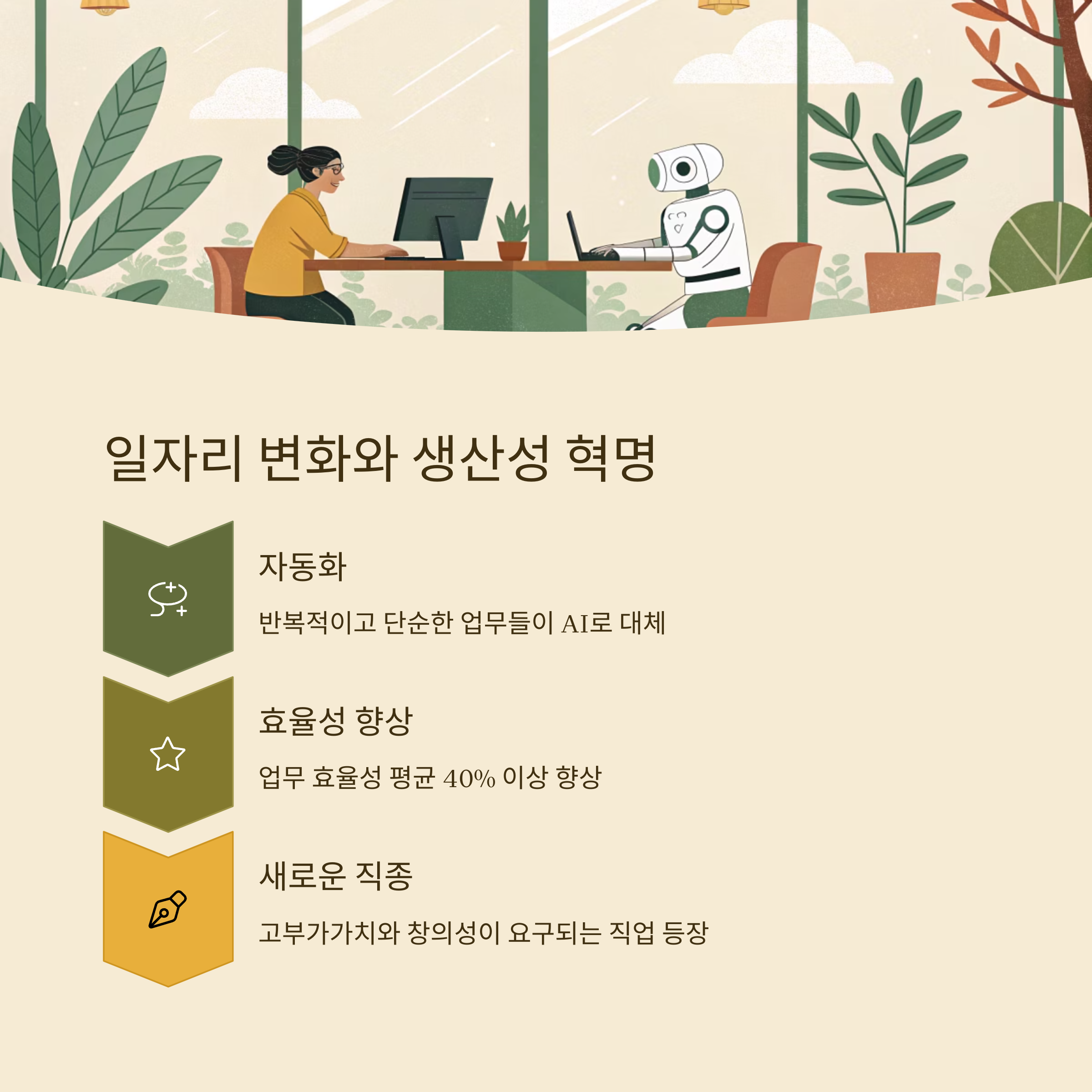 반복적이고 단순한 업무들이 AI로 대체되면서 일자리 구조가 근본적으로 변화하고 있습니다. 하지만 단순히 일자리가 줄어드는 것이 아니라, 고부가가치와 창의성이 요구되는 새로운 직종들이 등장하고 있어요.